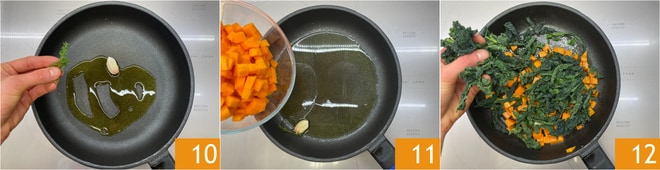 Em uma frigideira, aqueça o óleo com o dente de alho e o tomilho 10, depois adicione a abóbora 11 e cozinhe por 8 minutos. Junte a couve 12.