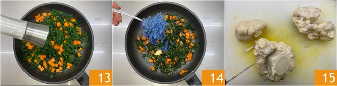 Tempere com sal 13 e salteie tudo por 5 minutos. Por último, adicione o repolho roxo escorrido 14, misture os ingredientes e reserve. Agora dedique-se à preparação do creme de couve-flor: limpe a couve-flor, obtendo apenas os floretes 15.