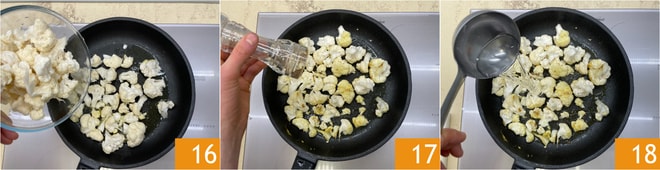 Em uma frigideira, aqueça o óleo e adicione a couve-flor 16, e doure por alguns minutos. Tempere com sal e pimenta 17, depois adicione uma concha de água 18.