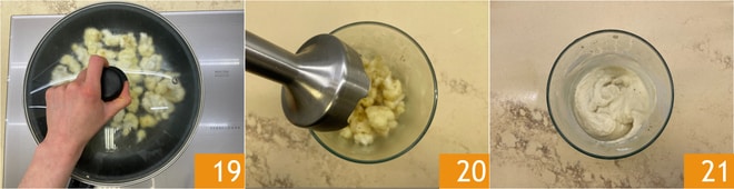 Cubra com uma tampa 19 e cozinhe por cerca de 20 minutos; se secar muito, pode adicionar mais água. Transfira tudo para um copo e bata com um mixer de imersão 20 até obter um creme liso e homogêneo 21. Reserve.