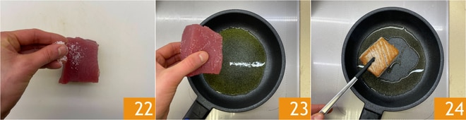 Por último, cuide do atum: tempere o filé dos dois lados com sal 22. Em uma frigideira, aqueça um pouco de óleo, adicione o atum 23 e sele por 2 minutos de cada lado 24.