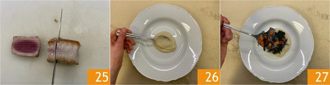 Corte o atum selado em fatias 25. Você está pronto para servir: no fundo do prato, distribua o creme de couve-flor 26, depois adicione os vegetais 27.