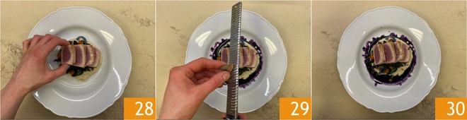 Coloque as fatias de atum sobre os vegetais 28, depois decore com o molho de repolho roxo. Complete com um fio de óleo e uma pitada de bottarga 29. O atum selado com ratatouille invernal está pronto para ser servido 30!