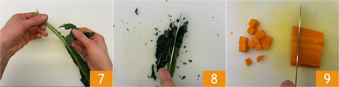 Limpe a couve removendo o caule central 7, depois corte em julienne 8. Corte a abóbora em cubos 9.