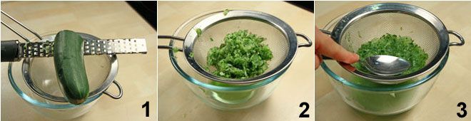 Para preparar os torcelli com tzatziki esmirniota lave o pepino, corte as extremidades e rale grosseiramente (mantendo a casca) em uma peneira colocada dentro de uma bacia 1. Neste ponto, deixe descansar por pelo menos 1 hora, para que toda a água de vegetação escorra 2 e, passado o tempo necessário, esprema ainda mais o pepino com as costas de uma colher 3.