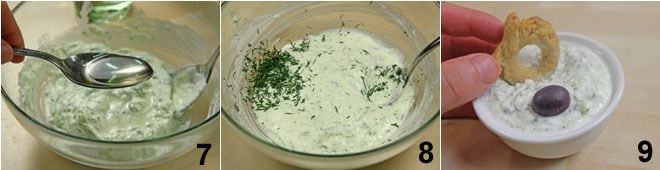 e o vinagre de vinho branco, continuando a misturar 7. Enquanto isso, pique finamente o endro e adicione à composição, em seguida ajuste o sal 8. Misture bem todos os ingredientes e o seu molho tzatziki está pronto. Personalize o seu tzatziki decorando com algumas azeitonas e acompanhando com os torcelli rústicos 9.