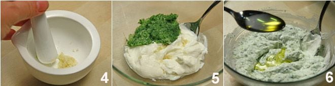 Neste ponto, pique finamente o alho e amasse com a ajuda de um pilão, até obter uma consistência o mais cremosa possível 4. Coloque o iogurte grego em uma tigela, em seguida adicione o alho e o pepino e misture usando uma colher ou um batedor para misturar os ingredientes 5. Despeje o óleo 6