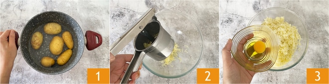 Para preparar a torrada de batata à pizzaiola, primeiro lave as batatas em água corrente e coloque-as em uma panela grande cheia de água. Cozinhe por cerca de 35 minutos 1. Quando estiverem macias, retire do fogo e deixe amornar. Retire a casca das batatas, passe-as no espremedor e coloque o purê em uma tigela 2. Adicione o ovo 3 à mistura.