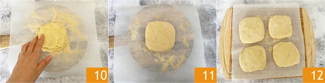 Feche o recheio 10 sempre com uma quantidade de massa de batata (também 80 g) e com as mãos dê novamente a forma quadrada 11. Com as quantidades indicadas, você obterá 4 torradas 12.