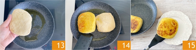 Em uma frigideira antiaderente, aqueça o azeite de oliva extra virgem. Adicione as torradas de batata à pizzaiola, no máximo duas de cada vez 13, e doure dos dois lados, virando de vez em quando por cerca de 10 minutos 14. Sirva as torradas de batata à pizzaiola bem quentes 15.