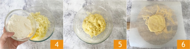 Adicione também o sal e a farinha de trigo 4. Misture a massa até obter uma massa macia e fácil de trabalhar 5. Coloque uma folha de papel manteiga em uma superfície de trabalho e polvilhe com farinha de rosca. Pegue uma quantidade de massa (80 g) e coloque sobre o papel manteiga, formando um quadrado com as mãos 6.
