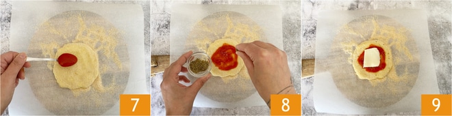 No centro, coloque uma colher de chá de molho de tomate 7, o orégano, o manjericão e uma fatia de mussarela bem escorrida e seca 9.