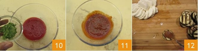 Despeje o molho de tomate em uma tigela, adicione o pesto 10 e misture tudo com uma colher 11. Neste ponto, todos os ingredientes estão prontos, basta montar suas torres de berinjela. Pegue uma primeira berinjela grelhada, adicione uma colher de chá de molho de pesto 12
