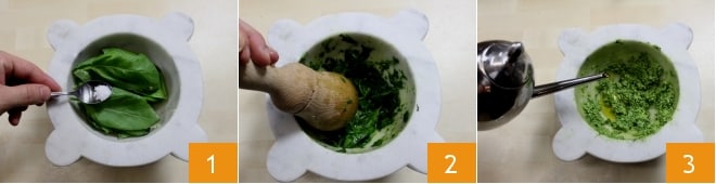Para preparar as torres de berinjela e mussarela, você pode começar a preparar o pesto que será combinado com o molho de tomate (se já tiver pronto o caseiro, pode usar 120 gr), você pode consultar o procedimento aqui: Pesto alla Genovese. Limpe as folhas de manjericão com um pano macio. Em um pilão (se não tiver, pode usar um mixer para todo o procedimento) coloque o alho descascado junto com alguns grãos de sal grosso, comece a amassar e quando o alho se transformar em creme, adicione as folhas de manjericão com uma pitada de sal grosso 1. Esmague, então, o manjericão contra as paredes do pilão girando o pilão da esquerda para a direita e simultaneamente gire o pilão no sentido contrário 2. Continue até que as folhas de manjericão liberem um líquido verde brilhante; então adicione os pinhões e comece a amassar novamente para reduzir tudo a um creme. Adicione os queijos aos poucos, misturando continuamente e por último o azeite de oliva extravirgem em fio 3. Misture bem os ingredientes até obter um molho homogêneo. Agora que o pesto está pronto, reserve.