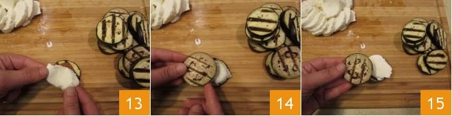 e posicione uma fatia de mussarela 13. Cubra novamente com uma berinjela grelhada 14 e repita a mesma operação por mais 2 vezes 15; ao todo, você deve fazer três camadas usando 4 fatias de berinjela.