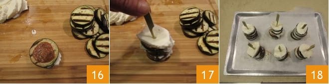 Uma vez posicionada a última fatia de berinjela, finalize com uma colher de chá de tomate 16, uma fatia de mussarela e espete a torre com um palito de dente para unir todas as camadas entre si 17. Transfira as torres para uma assadeira forrada com papel manteiga 18 e asse em forno estático pré-aquecido a 200° por 10 minutos.