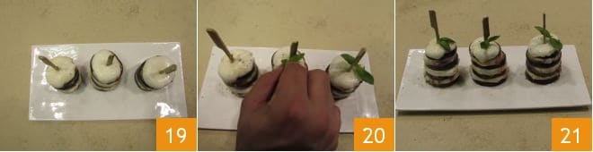 Uma vez retiradas do forno, coloque as torres de berinjela em um prato de servir 19, tempere com uma pitada de pimenta-do-reino, decore com as folhinhas de manjericão 20 e sirva-as ainda quentes 21.