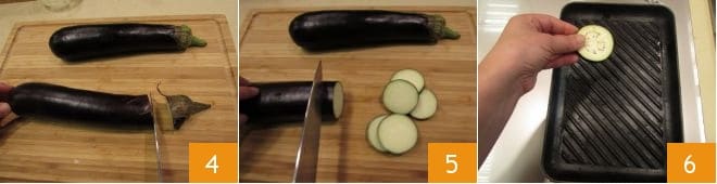 Continue a preparação com as berinjelas: lave-as e elimine as extremidades 4, em seguida, corte as berinjelas em fatias de cerca de 1 cm de espessura 5. Coloque uma grelha para aquecer no fogo e só quando estiver bem quente, posicione as rodelas de berinjela por cima 6.