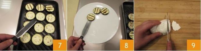 Aguarde cerca de 3 minutos e quando as berinjelas estiverem bem assadas, vire-as e continue a cozinhar por mais 3 minutos. Uma vez grelhadas, coloque as berinjelas em um prato 8 e reserve por um momento. Neste ponto, corte a mussarela em fatias de meio cm de espessura 9 e também reserve em uma peneira se a mussarela estiver muito úmida.