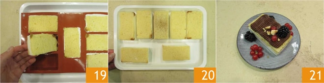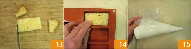 e faça 14 retângulos de 5x9 cm 13. Coloque 7 retângulos de pandoro em uma forma de silicone para 7 porções 14 e pressione levemente com os dedos. Transfira o creme de iogurte para um saco de confeitar sem bico 15.