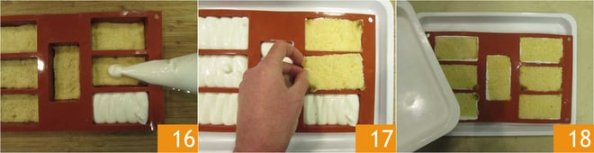 Preencha as formas até ½ cm da borda 16. Coloque por cima os 7 retângulos restantes de pandoro 17. Cubra as formas com uma placa 18 para deixá-las perfeitamente planas e leve os lingotes ao freezer por pelo menos 3 horas.