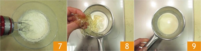 Reserve a mistura batida 7. Em uma panela, despeje os outros 20 g de creme de leite fresco e adicione a gelatina previamente amolecida com parte da água do molho 8, somando um peso total de 25 g. Aqueça os ingredientes até que a gelatina esteja completamente dissolvida 9.
