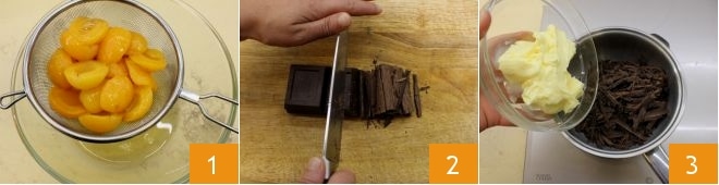 Para preparar o bolo de chocolate com damascos e amaretti, escorra os damascos do líquido de conservação 1. Em seguida, pique o chocolate amargo 2 e coloque-o em uma panela para derreter em fogo bem baixo junto com a manteiga 3.