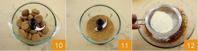 Em seguida, separe 12 amaretti e triture os restantes para reduzi-los a pó (10-11); peneire a farinha na massa 12 e misture com uma espátula;