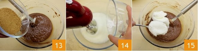 em seguida, adicione o pó de amaretti e misture bem 13. Bata as claras em neve com o restante do açúcar de confeiteiro 14. Delicadamente, incorpore as claras à mistura, mexendo de baixo para cima para não desmontá-las 15.