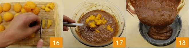 Por fim, seque os damascos com um pano de cozinha e corte-os em cubos pequenos 16, deixando 8 inteiros de lado para a decoração. Adicione os pedaços de damasco à massa e misture 17; depois, enfarinhe e forre com papel manteiga uma forma de 23 cm de diâmetro. Despeje a massa dentro 18 e distribua com uma espátula.