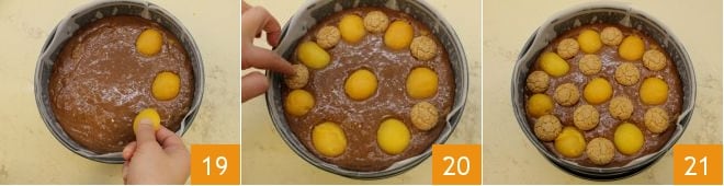 Então, coloque os damascos delicadamente na superfície, com a parte côncava voltada para cima 19. Você pode espaçá-los levemente e colocar 7 na borda e um no centro. Deixe espaço para os 12 amaretti, que podem ser alternados com os damascos 20. Uma vez terminado 21, asse o bolo em forno estático pré-aquecido a 180° por 45 minutos (160° por cerca de 35 minutos se forno ventilado).