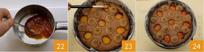 Enquanto isso, derreta em fogo bem baixo a geleia de damascos 22: quando o bolo estiver pronto, tire-o do forno e, ainda quente, passe a geleia nos damascos com um pincel 23. O bolo de chocolate com damascos e amaretti está pronto para ser servido 24!