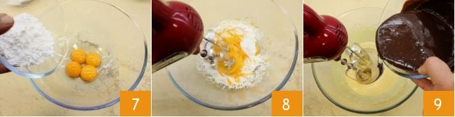 e bata as gemas com dois terços do açúcar de confeiteiro 7: você pode usar uma batedeira elétrica 8 ou um batedor manual. Depois, adicione o chocolate derretido já morno e continue misturando a massa 9.