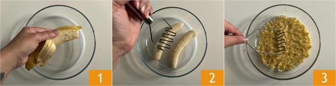 Para preparar o bolo de banana e chocolate, você deve usar duas bananas amassadas no interior e uma como decoração. Descasque duas das bananas 1 e amasse-as com um amassador de batatas ou um garfo 2 até obter uma pasta 3.