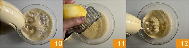 Depois de misturar 10, adicione a casca de um limão 11 e misture novamente 12.