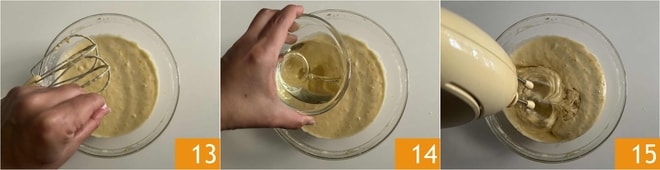 Em seguida, acrescente uma pitada de sal 13 e o óleo vegetal 14, continue sempre trabalhando tudo com a batedeira 15.