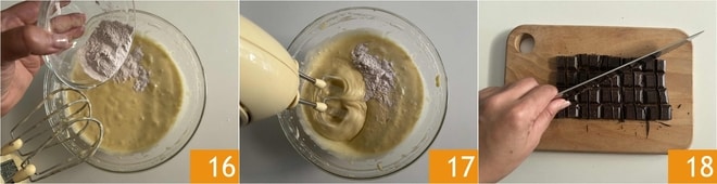 Adicione o fermento sempre previamente peneirado 16 e misture à massa 17. Em seguida, comece a cortar o chocolate amargo em pedaços, ou, se preferir, use gotas de chocolate 18.