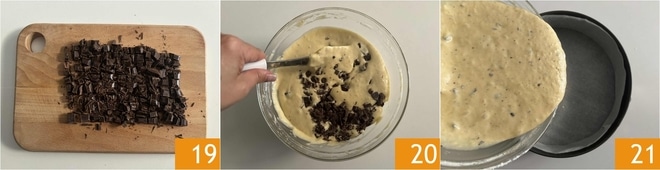 Quando tiver obtido seus pedaços de chocolate, coloque-os na massa, reservando algumas porções 19. Misture uma última vez 20 e despeje a massa em uma forma de 24 cm de diâmetro forrada com papel manteiga ou untada e enfarinhada 21.
