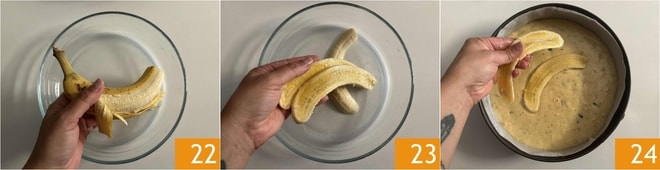 Descasque a banana reservada 22 e corte-a em três partes no sentido do comprimento 23, depois coloque-a na superfície do bolo 24.