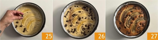 Por fim, adicione também alguns pedaços de chocolate 25 e asse o bolo em forno estático pré-aquecido a 180° por cerca de 35 minutos 26. Antes de tirar o bolo do forno, sempre faça o teste do palito, pois o tempo pode variar ligeiramente dependendo do forno. O bolo de banana e chocolate está pronto, basta deixá-lo esfriar 27 antes de desenformar e servir.