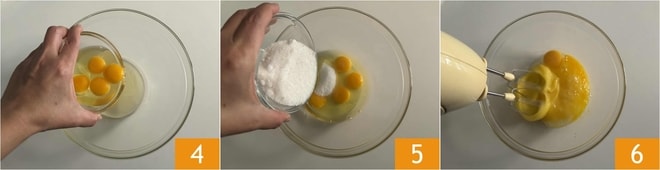 Coloque os ovos inteiros em uma tigela grande 4, adicione o açúcar 5 e comece a bater a mistura com uma batedeira até que fique clara, fofa e espumosa 6.