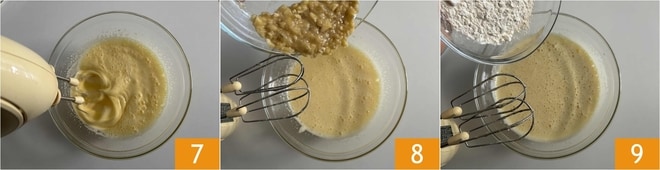 Depois de alcançar a consistência certa 7, adicione a polpa das bananas previamente amassadas e misture à massa 8. Em seguida, acrescente a farinha previamente peneirada 9.