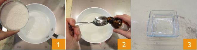 Por último, dedique-se à preparação da calda. Despeje em uma panelinha a água e o açúcar 1. Aqueça no fogo até que o açúcar se dissolva completamente, então retire do fogo e adicione o aroma de marasquino 2; se preferir uma calda alcoólica, você pode usar licor de marasquino. Transfira a calda para uma travessa e deixe esfriar 3.