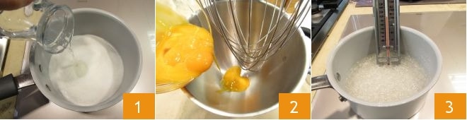 Enquanto isso, dedique-se à preparação do Creme de manteiga. Em uma panela de fundo grosso, misture o açúcar com a água 1, então aqueça em fogo baixo, mexendo de vez em quando com uma colher de aço. Enquanto isso, coloque as gemas na tigela da batedeira 2. Quando o açúcar estiver dissolvido, pare de mexer e leve a calda a 121°C 3, use um termômetro de cozinha para medir a temperatura. Ligue a batedeira para bater as gemas somente quando a calda estiver quase atingindo a temperatura indicada.