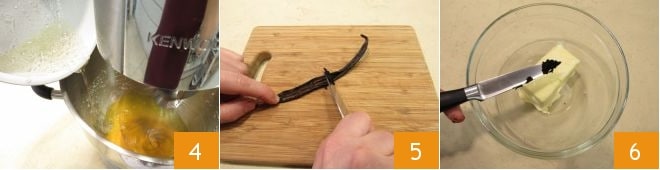 Adicione na tigela da batedeira a calda a fio 4, que já terá atingido a temperatura, e continue batendo até esfriar completamente. Enquanto isso, corte a fava de baunilha e retire as sementes com uma faquinha 5. Neste ponto, coloque a manteiga em temperatura ambiente em uma tigela, e adicione também as sementes da fava de baunilha 6.
