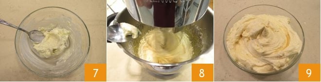 Com a ajuda de uma colher, comece a trabalhar até obter um composto homogêneo 7. Incorpore então a manteiga de baunilha na batedeira 8, adicionando uma colher de cada vez e continue batendo até obter um composto cremoso 9. Coloque o creme de manteiga em uma tigela 9 e guarde na geladeira até o momento de usar.