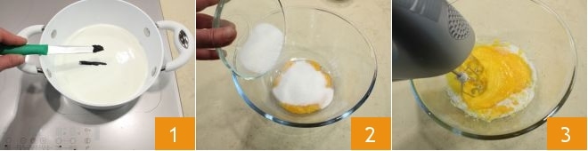 Enquanto o bolo assa, dedique-se à preparação do Creme de confeiteiro. Despeje o leite e o creme de leite em uma panela grande e coloque-a no fogo. Pegue a fava de baunilha, corte com uma faquinha, retire as sementes e junte-as à fava na panela com leite e creme 1. Assim que começar a ferver, desligue o fogo e deixe em infusão por 5 minutos. Enquanto isso, separe as claras das gemas e coloque-as em uma tigela grande. Adicione também o açúcar na tigela das gemas 2 e bata com um batedor elétrico 3 ou um batedor manual, até obter um creme homogêneo e espumoso.