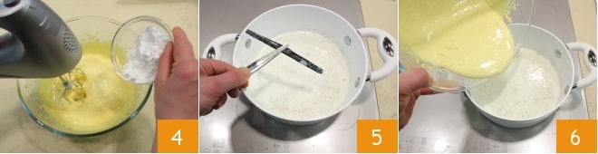 Em seguida, adicione também o amido de milho 4 e continue batendo. Retire a fava de baunilha da mistura de leite e creme 5, e mexendo rapidamente, adicione a mistura de ovos e amido recém-preparada 6.