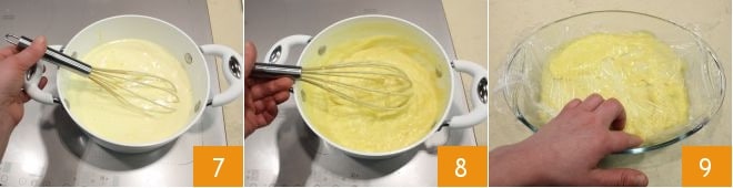 Ligue novamente o fogo baixo e continue mexendo continuamente 7, até que seu creme de confeiteiro esteja espesso 8. Neste ponto, desligue o fogo e transfira o creme para uma tigela baixa e larga. Cubra imediatamente com filme plástico em contato 9, para que não se forme a película desagradável. Deixe esfriar primeiro em temperatura ambiente e depois na geladeira.