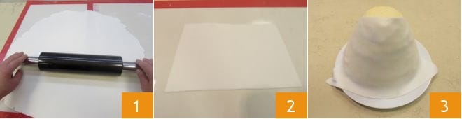 Neste ponto, comece a decoração do seu bolo Barbie. Retire 150 g dos 500 g de pasta americana branca e estenda-a sobre um tapete 1 polvilhado com amido de milho. Forme um retângulo 2 fino, com cerca de 2-3 mm de espessura, que cobrirá cerca de metade do bolo. Posicione-o horizontalmente na parte do bolo voltada para você e faça-o aderir bem ao creme de manteiga, sem dobrar a borda superior da camada de pasta americana sobre o pão de ló 3.